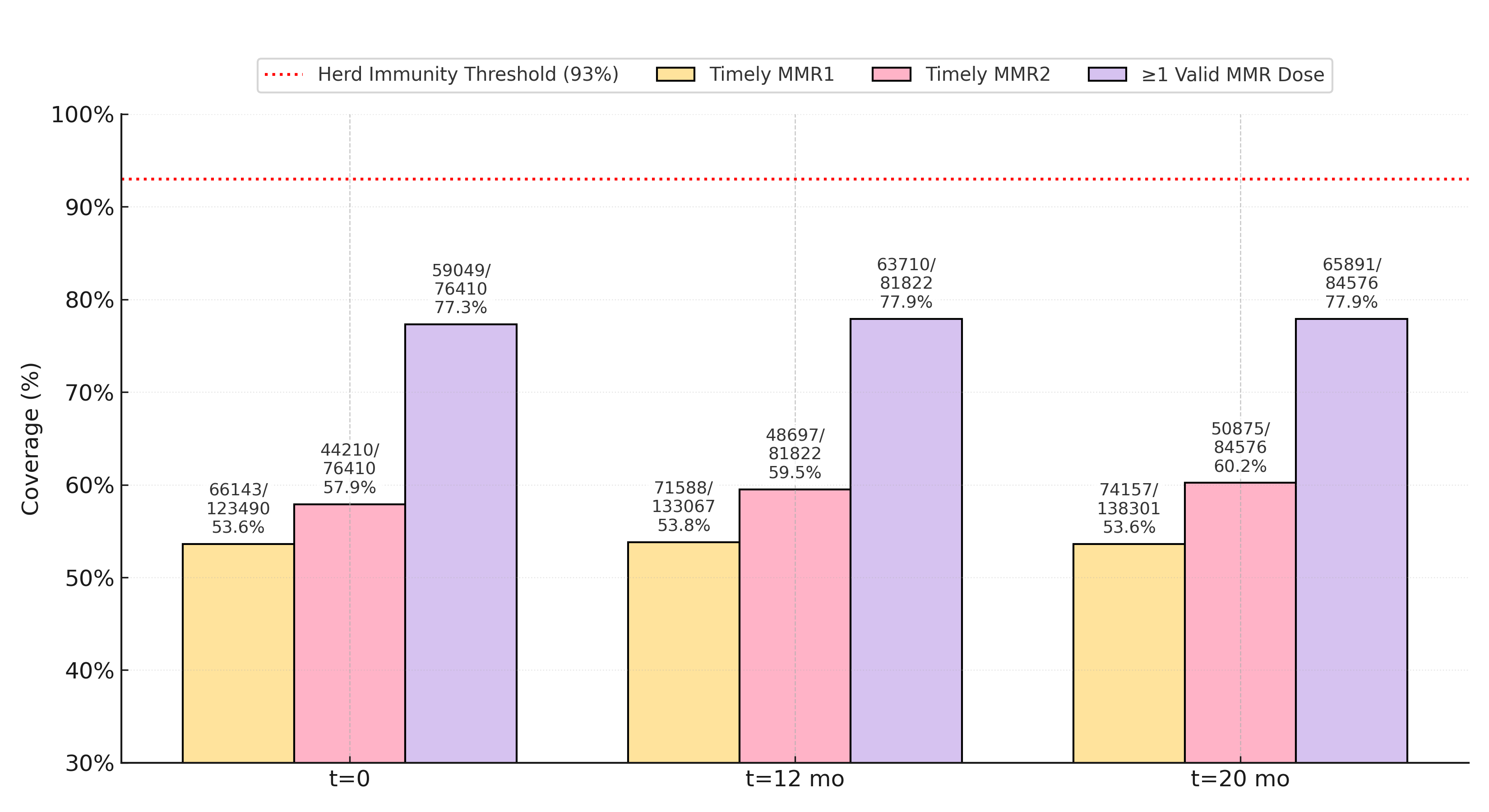 Timely MMR1, timely MMR2, and any-dose MMR coverage among children younger than 15 years of age in a large Primary Care Network (PCN) at outbreak onset (t = 0), 12 months (t = 12), and 20 months (t = 20) following the 2022–2023 central Ohio postelimination measles outbreak. The red dashed line marks the herd immunity threshold (93%). Across all timepoints, coverage remained well below this threshold, indicating a persistent system-wide deficit in measles immunity. At outbreak onset (n = 133,476), timely MMR1 coverage was 53.6% and did not change at 12 or 20 months (RD = 0.1 percentage points; 95% CI, –0.3 to 0.4; p = .76). Timely MMR2 rose modestly from 57.9% to 60.2% by 20 months (RD = 2.3 pp; 95% CI, 1.7–2.8; p < .001). Any-dose MMR coverage increased only slightly, from 77.3% to 77.9% (RD = 0.6 pp; 95% CI, 0.2–1.0; p = .003). These findings highlight the limited impact of outbreak response efforts and the ongoing vulnerability of the PCN population nearly two years later. Abbreviations: PCN, Primary Care Network; MMR, measles-mumps-rubella vaccine; RD, risk difference; CI, confidence interval; pp, percentage points.