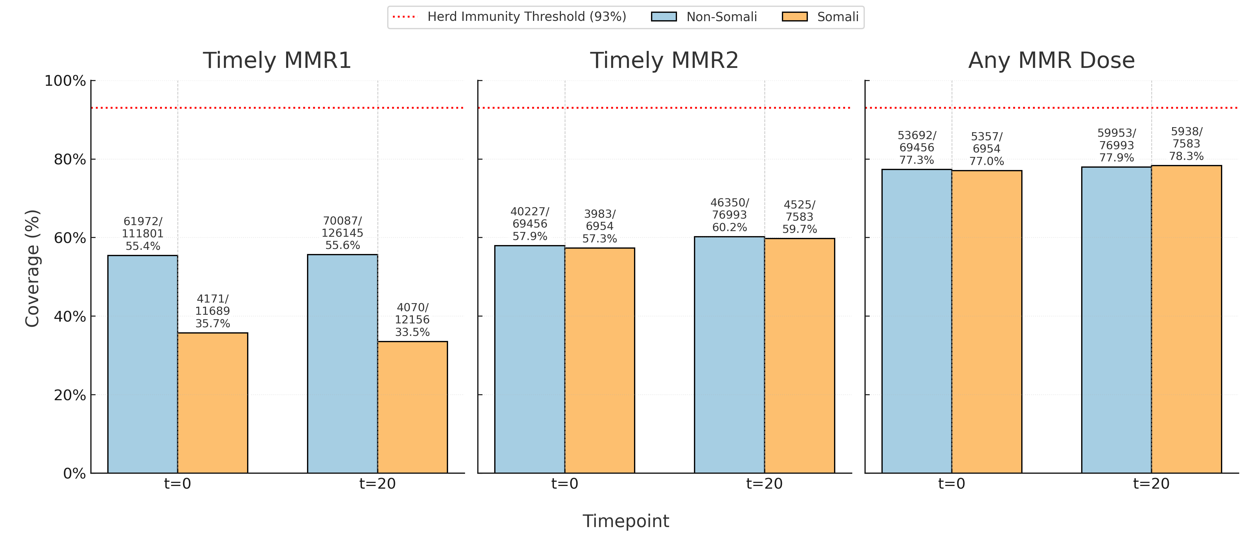 Timely MMR1, timely MMR2, and any-dose MMR coverage among Somali (orange bars) and non-Somali (blue bars) children younger than 15 years of age within a large Primary Care Network (PCN) at outbreak onset (t = 0) and 20 months later (t = 20) following the 2022–2023 central Ohio postelimination measles outbreak. The red dashed line marks the herd immunity threshold (93%). Across the entire PCN, coverage in both groups remained far below this threshold, underscoring a persistent system-wide deficit in measles immunity. Within this broader gap, Somali children consistently had markedly lower timely MMR1 coverage: at outbreak onset, 35.7% versus 55.4% (RD –19.7 percentage points; 95% CI, –20.6 to –18.7; p < .001), and at 20 months, 33.5% versus 55.6% (RD –22.1; 95% CI, –23.0 to –21.2; p < .001). By contrast, differences in timely MMR2 coverage (RD –0.6 pp; 95% CI, –1.5 to 0.3; p = .18 at baseline; RD –0.5 pp; 95% CI, –1.4 to 0.5; p = .33 at 20 months) and in receipt of any MMR dose (RD –0.3 pp; 95% CI, –1.2 to 0.6; p = .49 at baseline; RD 0.4 pp; 95% CI, –0.5 to 1.3; p = .37 at 20 months) were small and not statistically significant. Abbreviations: PCN, Primary Care Network; MMR, measles-mumps-rubella vaccine; RD, risk difference; CI, confidence interval; pp, percentage points.